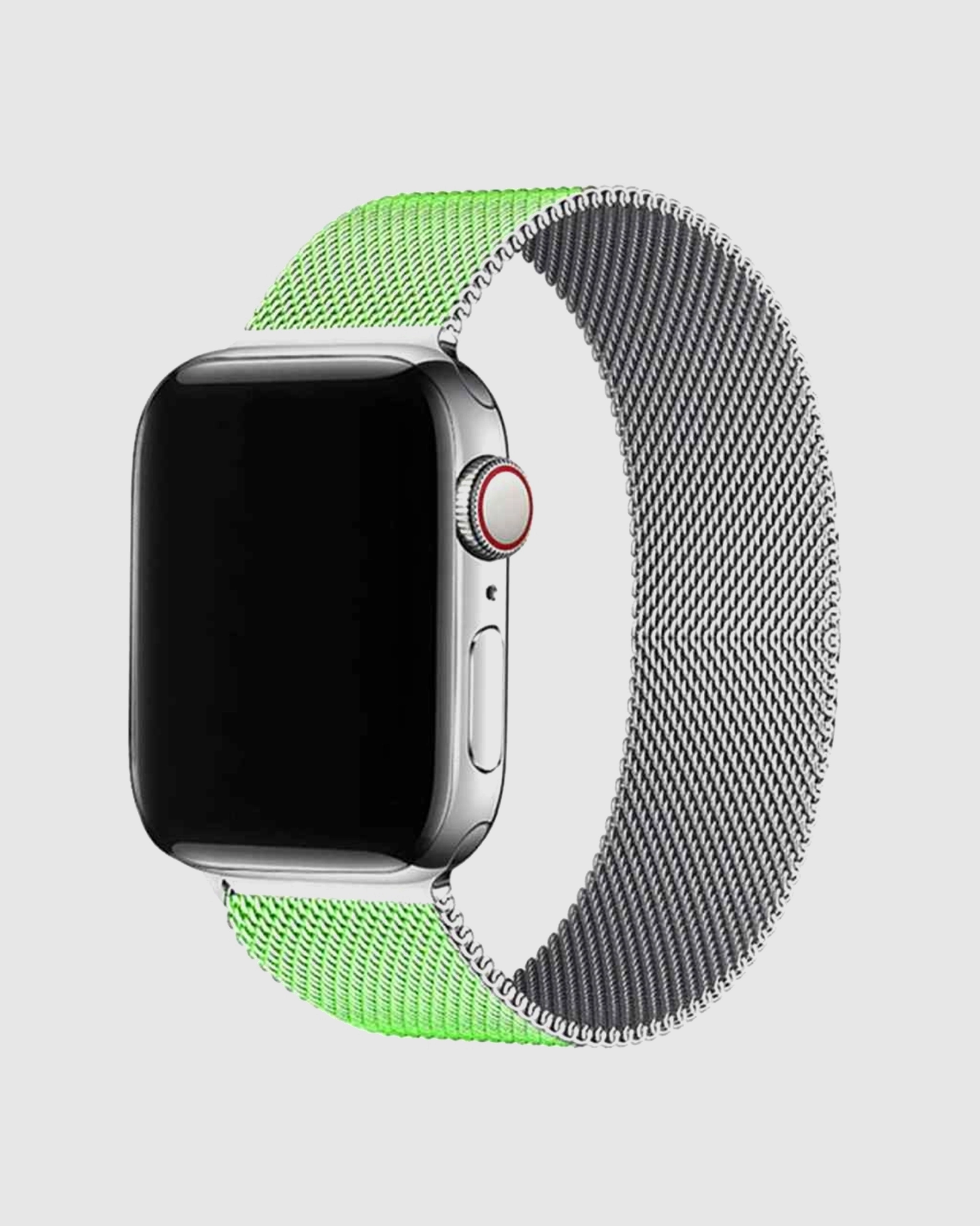 Discover elegance and comfort with the Duo Green Silver Milanese Loop for Apple Watch, featuring magnetic stainless steel for a perfect fit.