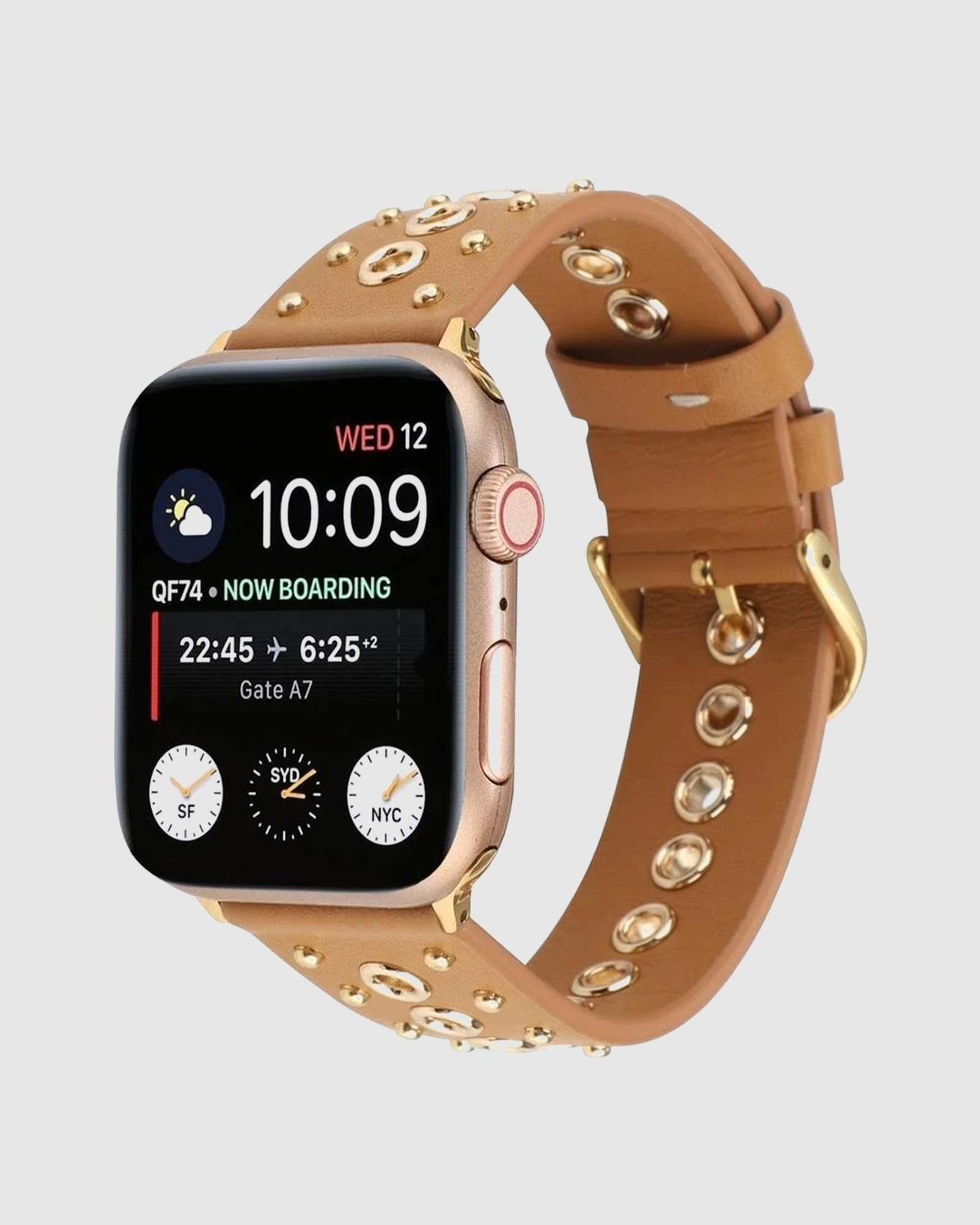 Elevate your style with the Elektra Leather Band with Gold Rivets for Apple Watch in a stunning brown hue. Crafted from premium leather, this sophisticated band complements any outfit while providing the comfort and durability you expect from high-quality accessories. The eye-catching gold rivets add a touch of elegance, ensuring you stand out in a crowd. Whether youre heading to the office or out for a casual evening, this versatile band enhances your Apple Watch’s appearance, making it suitable for every occasion. Featuring a secure closure and easy installation, the Elektra Leather Band is designed for both functionality and flair. Transform your Apple Watch into a fashion statement today!