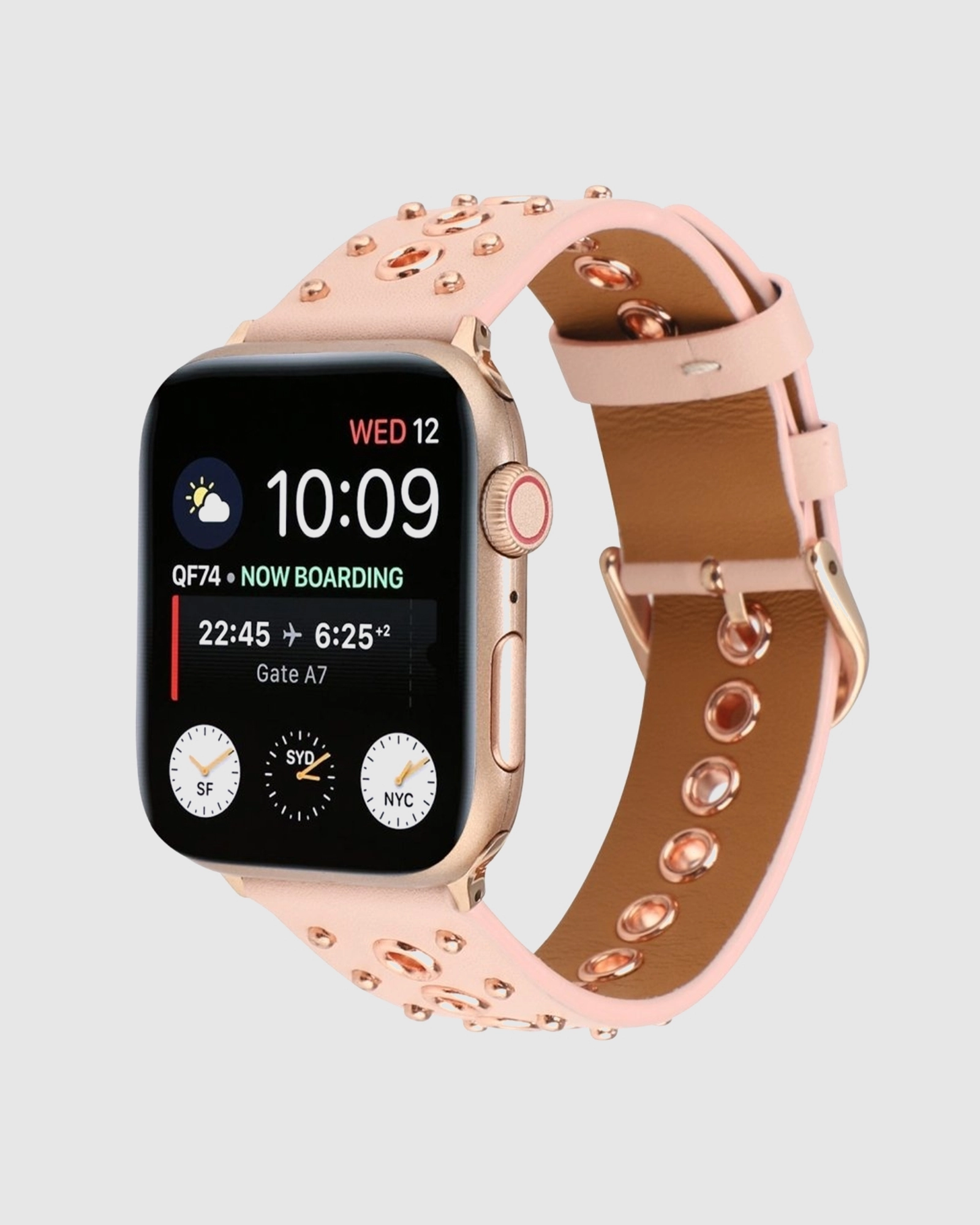 Elevate your style with the Elektra Leather Band for Apple Watch, featuring exquisite rose gold rivets that perfectly complement its chic pink leather design. Crafted for both comfort and fashion, this band offers a sophisticated look that effortlessly transitions from casual outings to formal events. The high-quality leather ensures durability while providing a soft touch against your skin. With an easy-to-use installation mechanism, it fits securely on your Apple Watch, making it the ideal accessory for any outfit. Stand out in any crowd with this stunning pink band that not only enhances your watch’s aesthetics but also showcases your unique sense of style. Transform your Apple Watch experience with the Elektra Leather Band and make a fashion statement today.
