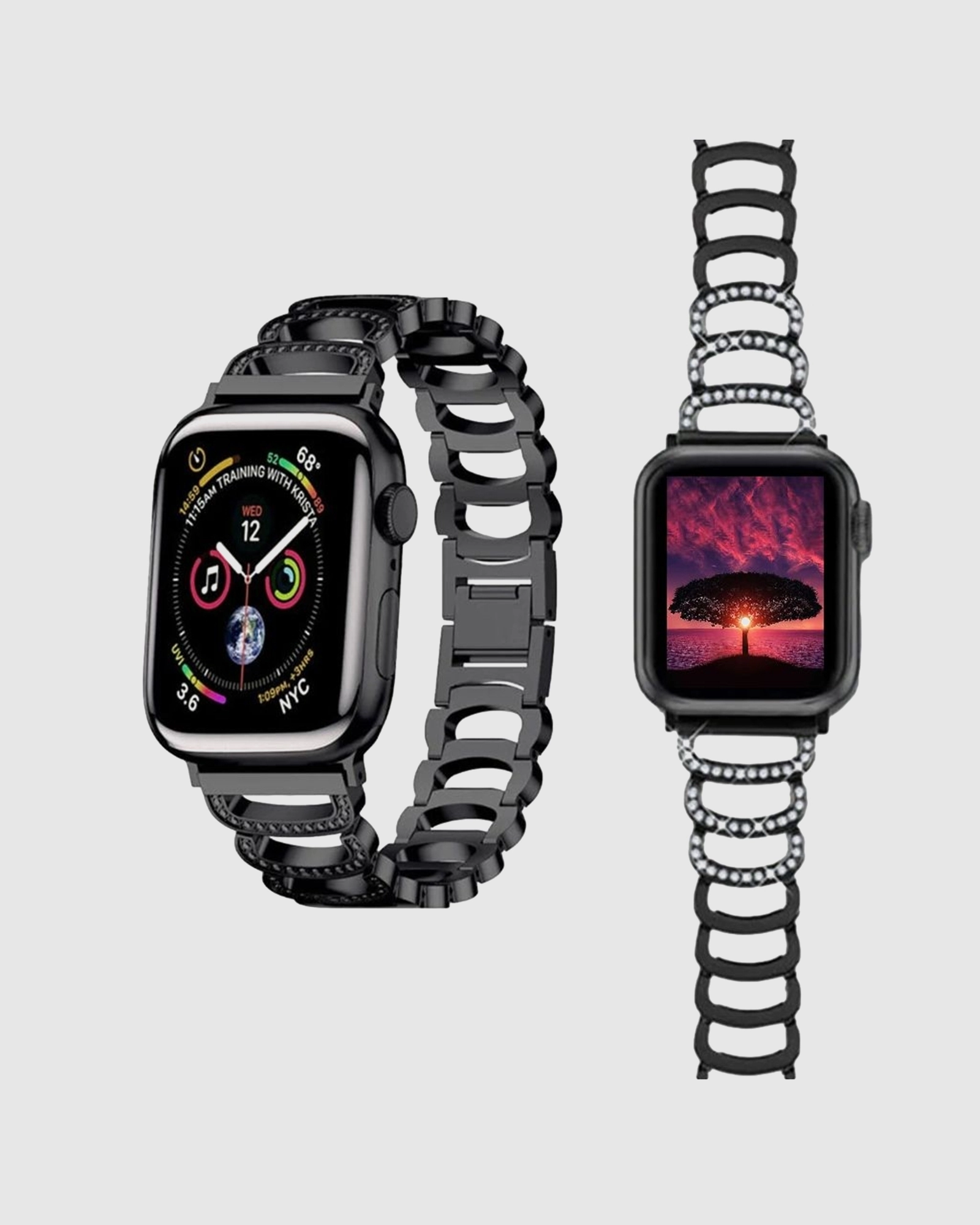Elevate your style with the Halo Bracelet Band for Apple Watch in sleek black. This dazzling accessory not only enhances your Apple Watch but also makes a striking fashion statement with its polished stainless steel construction. The distinctive link-bracelet design offers a blend of elegance and comfort, making it perfect for both casual outings and formal events. This high-quality watch band fits wrist sizes ranging from 125mm to 180mm, ensuring a custom fit with adjustable links, which can be tailored by any local jeweller. Crafted for comfort, its ideal for day-to-night wear, though it should be kept away from water to maintain its pristine condition. Upgrade your Apple Watch with this gorgeous Halo Bracelet Band and enjoy attention wherever you go.