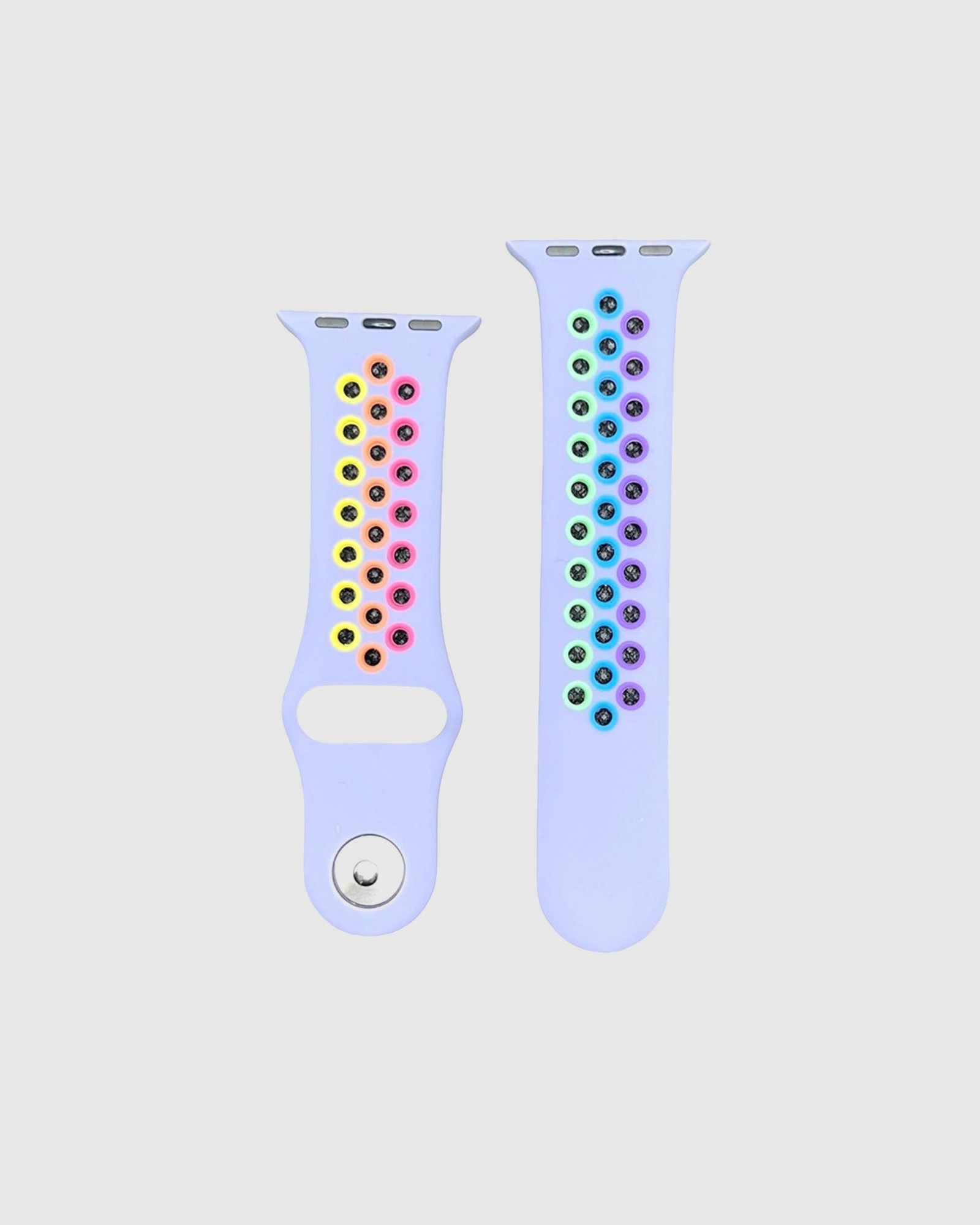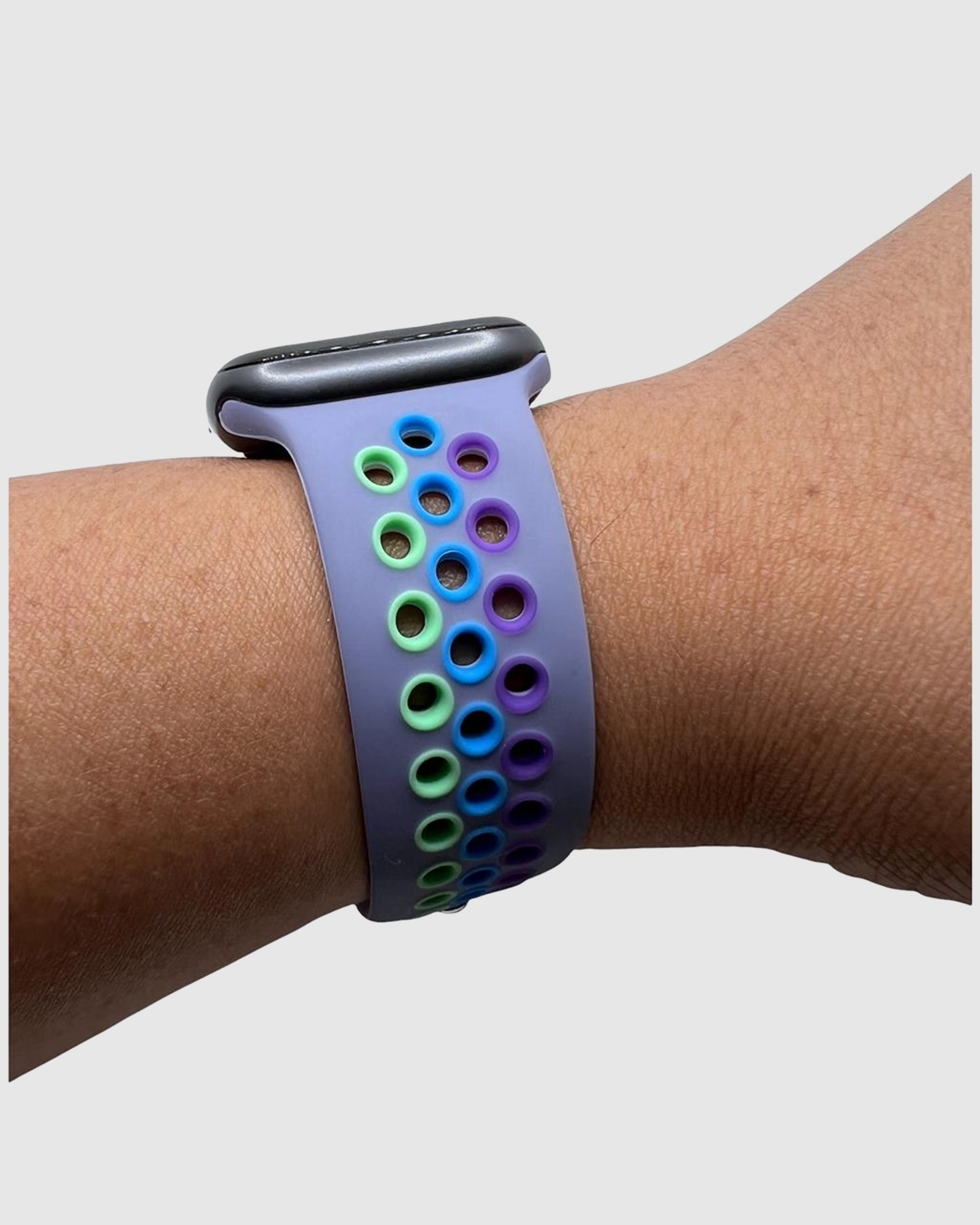 Elevate your style with the Lavender Gray/Rainbow Pride Sport Band Active for Apple Watch. Crafted from a custom-developed, high-performance fluoroelastomer, this band is designed for durability and comfort. Featuring compression-moulded perforations for breathability, it feels soft against your wrist while also providing a secure fit. The smooth and dense material drapes elegantly, making it perfect for daily wear or workouts. With an innovative pin-and-tuck closure, you can achieve the perfect fit tailored to your wrist size. Available in various sizes to ensure a comfortable fit for everyone. Celebrate individuality and express your pride with this vibrant and stylish band, perfect for anyone looking to add a splash of colour to their Apple Watch. Whether you’re hitting the gym or out for a casual day, this band combines functionality and flair seamlessly, making it a must-have accessory for every Apple Watch wearer.