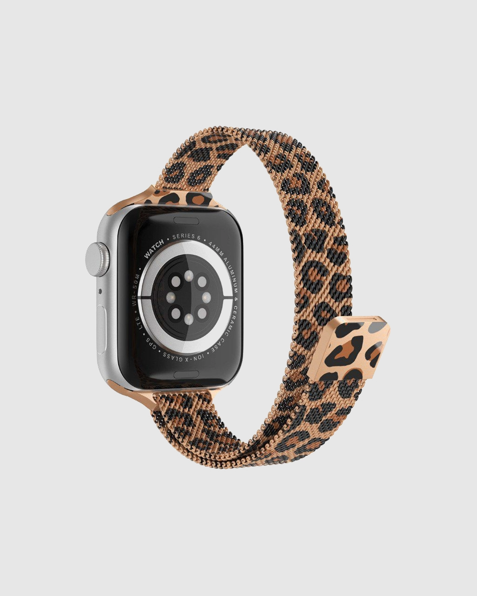 Elevate your Apple Watch with the Leopard Rose Gold Aurora Slim Milanese Band, a stunning blend of style and functionality. Crafted from a smooth, flexible Milanese steel mesh, this band offers unparalleled comfort for all-day wear. Its unique leopard print design in a lustrous rose gold finish adds an exotic touch, making it perfect for both casual outings and elegant events. Easily adjustable, this band allows you to find the perfect fit without sacrificing style. Whether youre going to the office or hitting the town, this band ensures your Apple Watch complements your outfit flawlessly. Upgrade your wrist game today with this exquisite Milanese band that marries sophistication with a hint of wild flair.