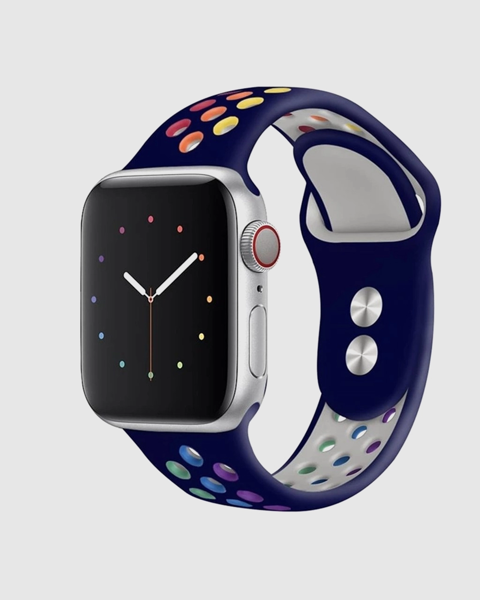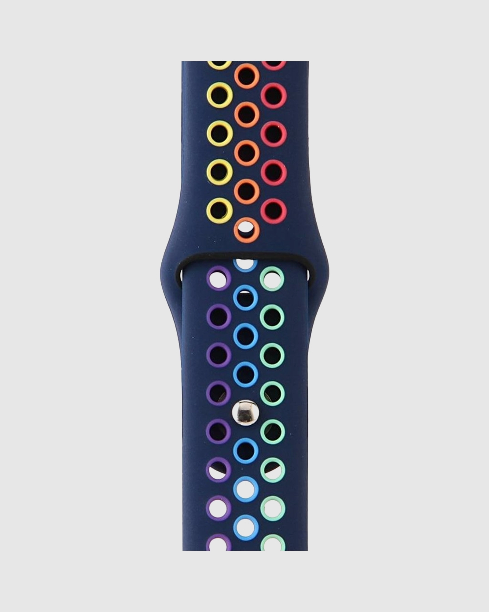 Embrace style and functionality with the Midnight Blue/Rainbow Pride Sport Band Active for Apple Watch. Crafted from a custom-developed high-performance fluoroelastomer, this band combines durability with a soft, breathable design. The compression-moulded perforations ensure optimal airflow, making it perfect for sports or daily wear. Its elegant drape provides comfort against the skin, while the innovative pin-and-tuck closure guarantees a clean, secure fit. Available in multiple sizes to accommodate various wrist measurements, this sport band seamlessly integrates vibrant colours and a modern aesthetic. Celebrate individuality and pride with this stunning accessory that not only complements your Apple Watch but also showcases your unique identity. Whether you’re hitting the gym, going for a run, or simply lounging at home, the Midnight Blue/Rainbow Pride Sport Band adapts to your lifestyle with ease. Choose quality, comfort, and a splash of personality with every wear.