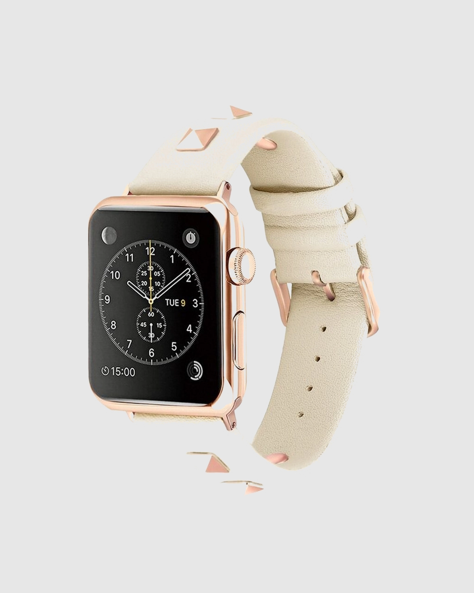 Elevate your style with the Rockstar Leather Band with Rose Gold Studs for Apple Watch in Beige, where fashion meets functionality. Crafted from high-quality genuine leather, this band is adorned with striking rose gold studs that transform your watch into a chic accessory. The band features durable stainless steel lugs and a nickel-free buckle, ensuring comfort and longevity. Designed to fit most wrist sizes between 13cm and 18cm, it’s perfect for anyone looking to add a touch of glamour to their everyday wear. Whether you’re dressing up for a special occasion or seeking a stylish upgrade for daily activities, the Rockstar Leather Band is your go-to choice. Experience the perfect fusion of elegance and edge that promises to turn heads and invite compliments. Note: Apple Watch not included.