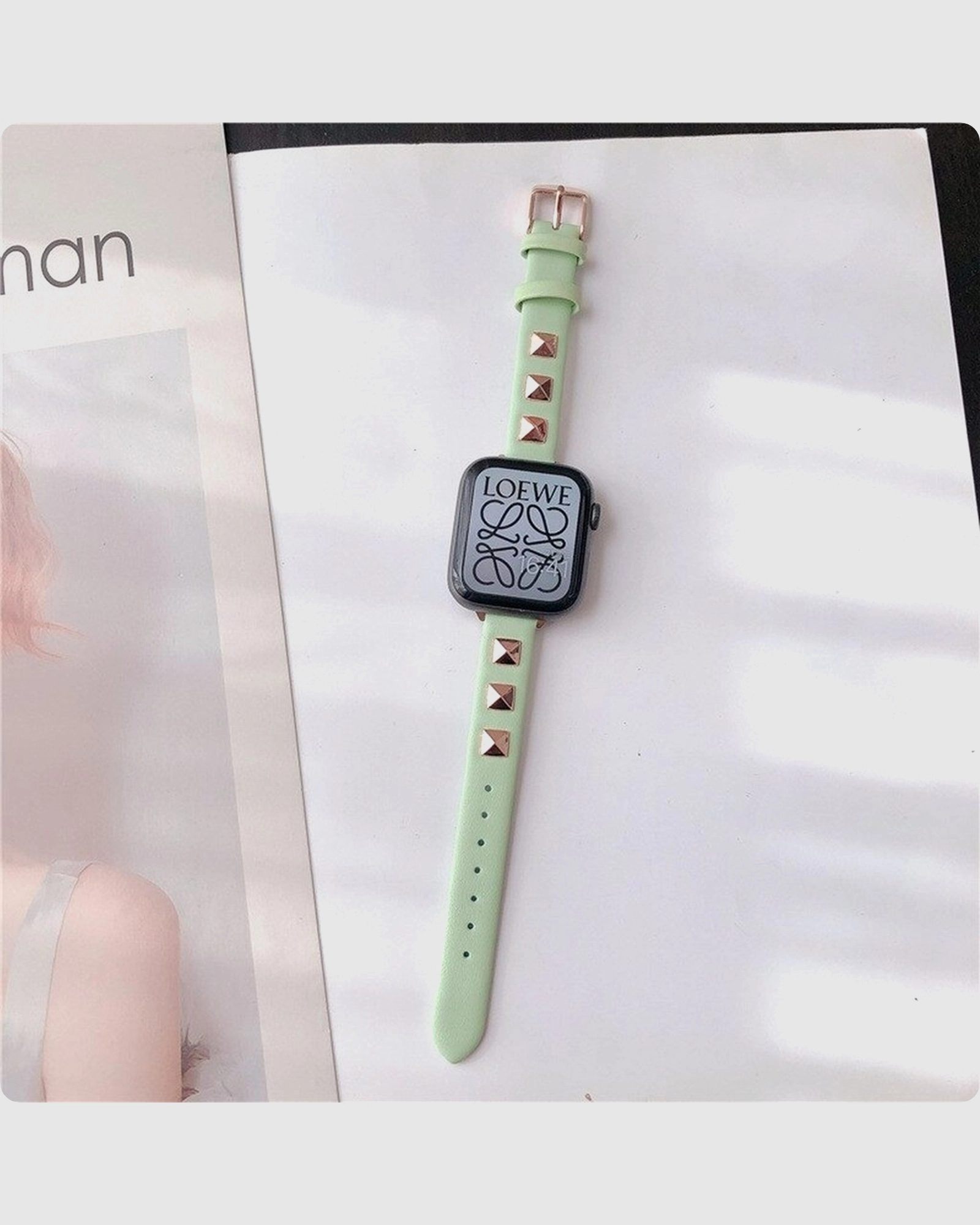 Transform your Apple Watch with the Rockstar Slim Leather Band in Light Green, featuring gold studs for a stylish and elegant look.