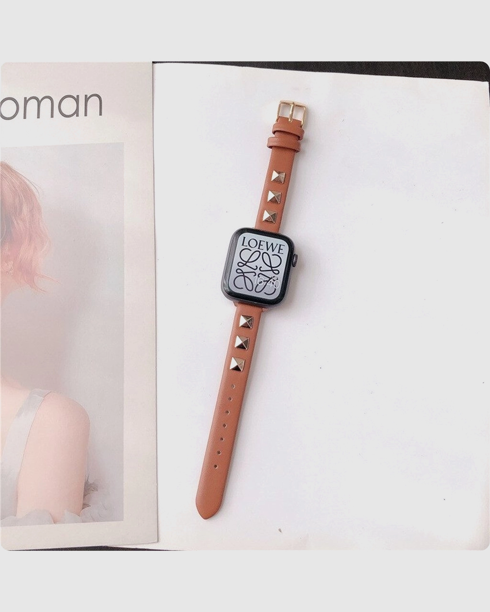 Upgrade your Apple Watch with our Rockstar Slim Leather Band in Saddle Brown, featuring luxurious gold studs for a stylish touch.