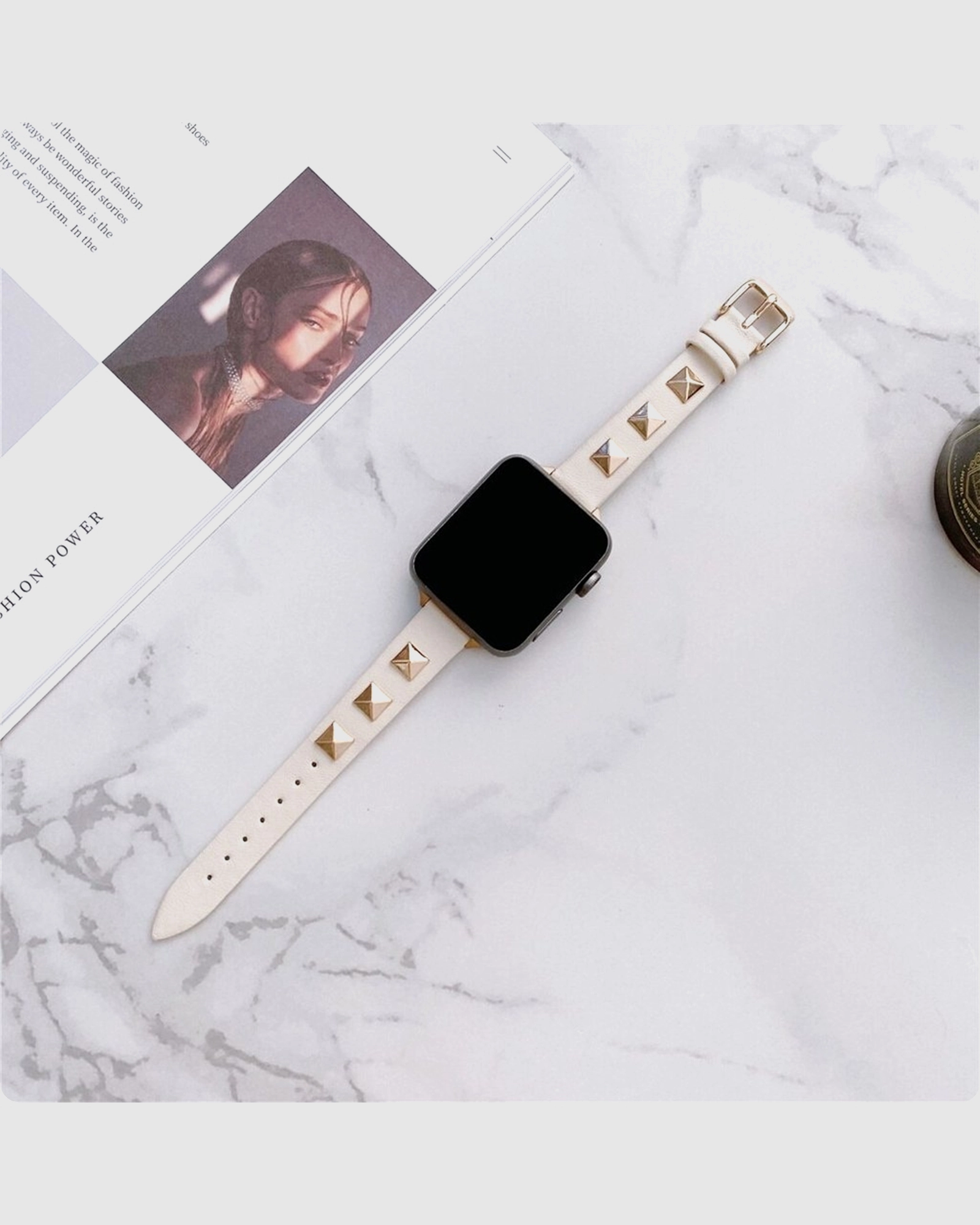 Elevate your style with the Rockstar Slim Leather Band with Rose Gold Studs for Apple Watch in Cream. This exquisite band combines luxurious cream leather with striking rose gold studs, offering a chic and trendy aesthetic. Designed for comfort and durability, the slim profile fits seamlessly on your wrist, making it perfect for everyday wear or special occasions. The easy-to-use buckle ensures a secure fit, while the soft leather promises all-day comfort. Compatible with various Apple Watch models, this band effortlessly enhances your tech while expressing your personal style. Transform your Apple Watch into a fashion statement with this unique and elegant accessory. At just $59.95, its an affordable luxury that doesnt compromise on quality or style. Dont just wear a watch, make it a stylish accessory with the Rockstar Slim Leather Band today!