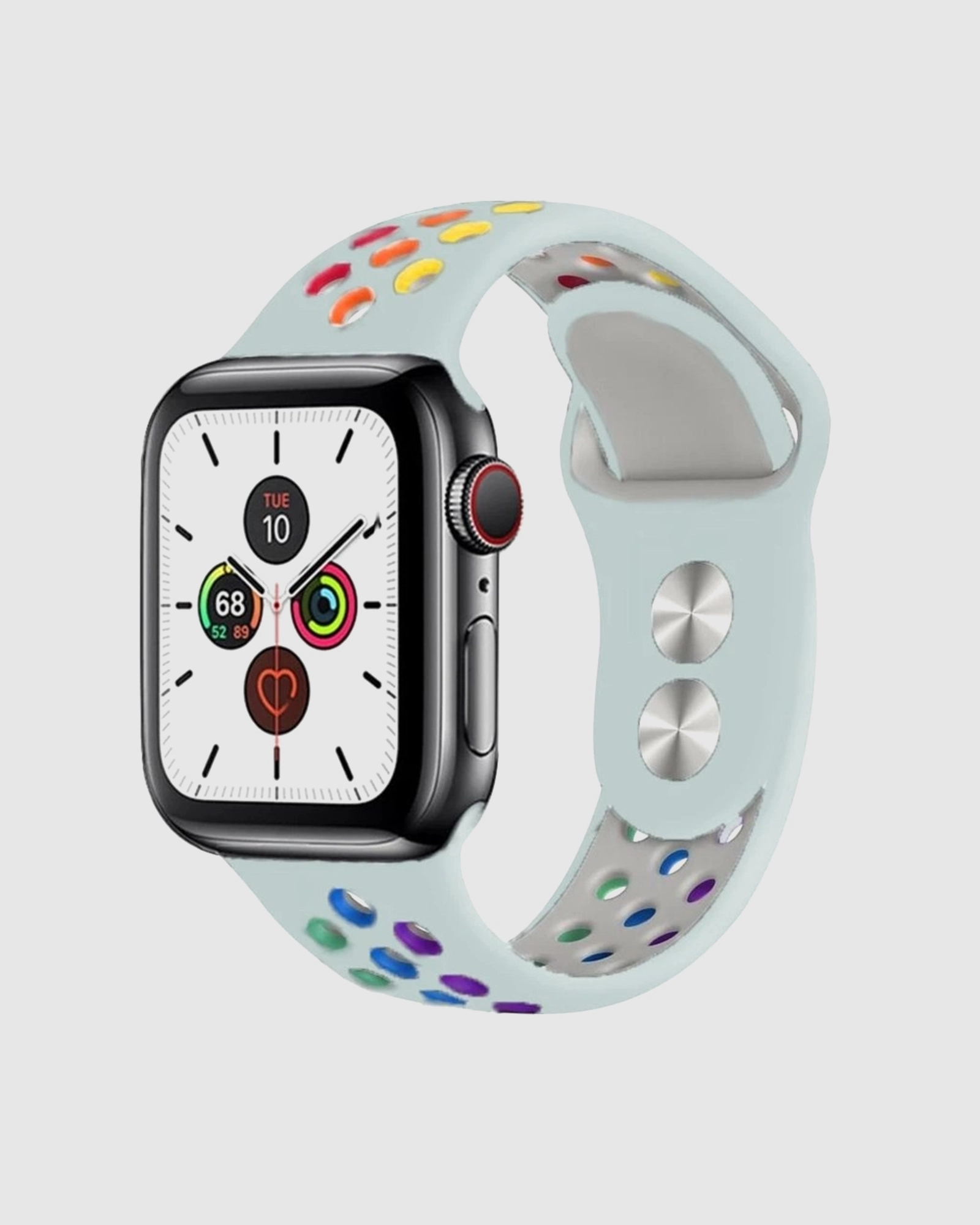 Express your vibrant personality with the Turquoise/Rainbow Pride Sport Band Active for Apple Watch. Crafted from a custom-developed high-performance fluoroelastomer, this sport band combines durability with comfort. Its compression-moulded perforations ensure breathability during workouts, making it the ideal accessory for any fitness enthusiast. The smooth, dense material feels great against your skin, giving you a luxurious touch while you stay active. The innovative pin-and-tuck closure delivers a clean, personalised fit, ensuring it stays secure on your wrist. Available in varying sizes for both 38mm/40mm and 42mm/44mm Apple Watch models, you can find the perfect fit for your wrist ranging from 125mm to 210mm. Elevate your Apple Watch experience with style and pride, perfect for celebrating diversity and love in all its forms. Whether youre hitting the gym or out on the town, this band stands out with its vibrant colours while maintaining functionality. Join the movement of inclusivity and fashion, making every moment a statement. Unlock your potential with a sport band thats as bold as you are!